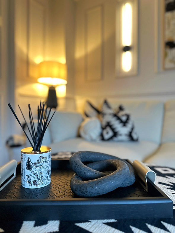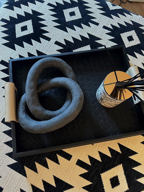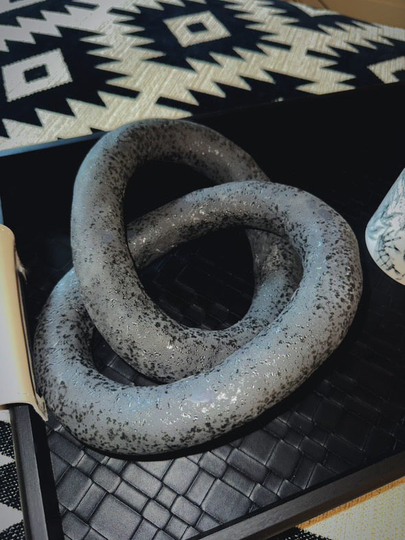 Introduce bold sophistication to your decor with our Velvet & Vigor Black Knot Sculpture. This modern, on trend piece is versatile and can be used as a two link decor piece, perfect for a table or media wall to add the perfect finishing touch. Crafted from durable ceramic and acrylic, this art deco sculpture is a must-have decorative accessory. Elevate your space with this exclusive piece.