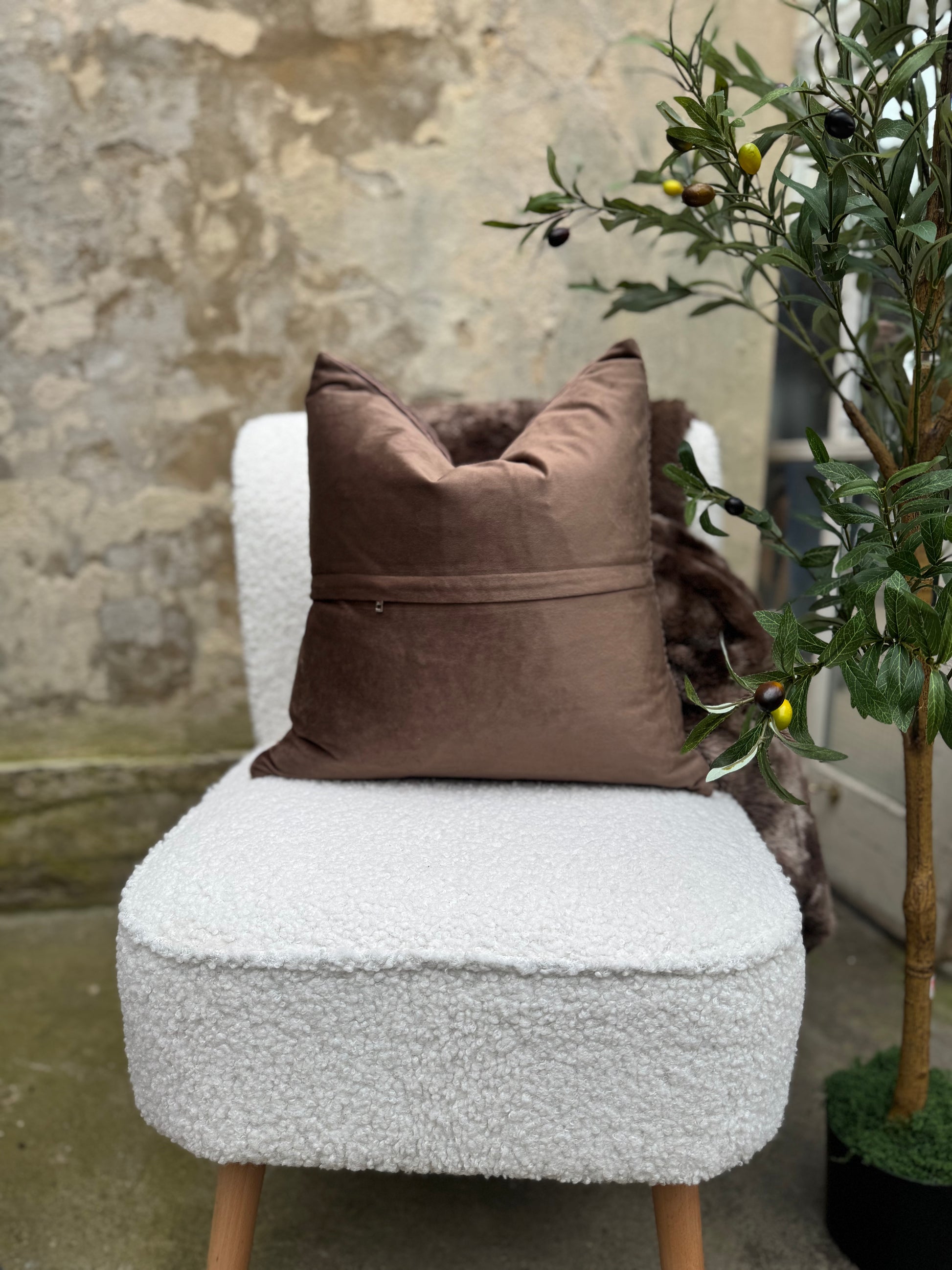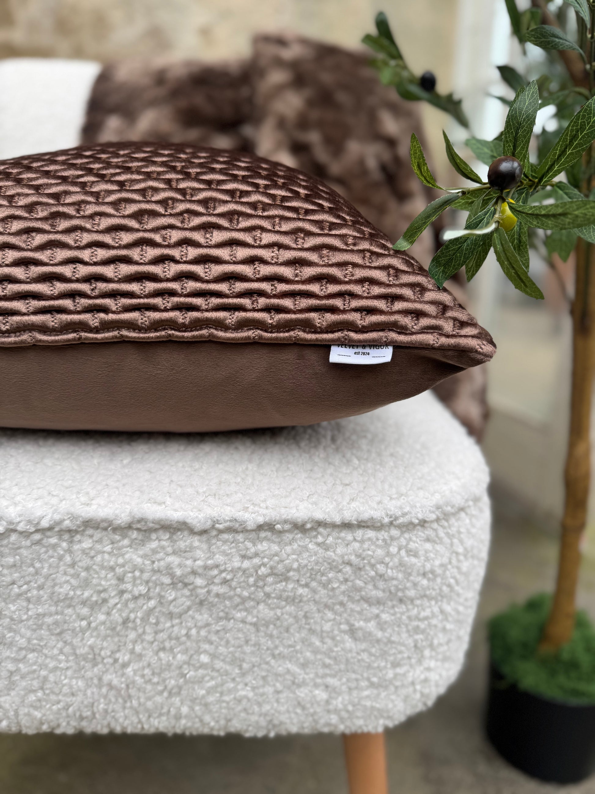 The Ribbed Velvet Cushion in rich brown features a modern ribbed design and a concealed zip for a streamlined look. This earth-toned accent cushion enhances sofa decor and adds a layer of texture to home accessories, contributing to an inviting and sophisticated living space.
